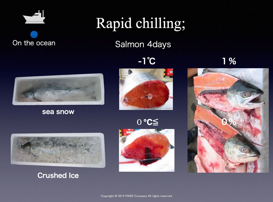물고기도 인간과 마찬가지로 체액의 농도가 약 1%입니다. 기존의 얼음 농도는 “0%”이므로 물고기가 얼음이나 녹은 물에 닿으면 삼투압차로 체액이 흘러, 색이 희게 되거나 신질이 나빠져 부패가 진행되기 쉬워집니다. Sea Snow® 의 염분 농도는 항상 약 1%를 유지하기 때문에, 물고기와 접촉하여도 삼투압차가 생기지 않아 변색도 없고 고선도가 유지됩니다.
