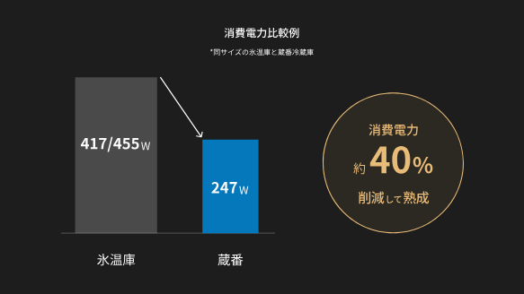 그에 비해, 창고에서 숙성시키는데 걸리는 소비 전력은 종래의 냉장고와 거의 변하지 않습니다 . 이것에 의해, 비용을 억제할 수 있는 것으로 장기적인 운용이 하기 쉬운 숙성 방법입니다.