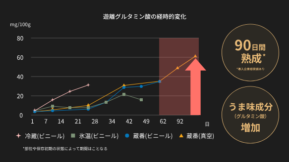 한편, 주요 맛 성분인 글루탐산은 숙성 기간에 걸쳐 증가 합니다. 다른 습식 에이징 방법에 비해 증가 추세가 강하다는 것을 알고 있습니다