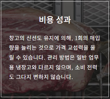 창고 숙성에서는 다른 습식 에이징 방법(냉장·빙온)과 비교하여 열화 의 원인이 되는 균의 증식을 대폭 억제하면서 숙성을 진행할 수 있습니다. 균을 억제하는 것으로 안전하게 장기 숙성할 수 있기 때문에, 구입량을 늘릴 수 있어 코스트 퍼포먼스의 높이로 연결됩니다.